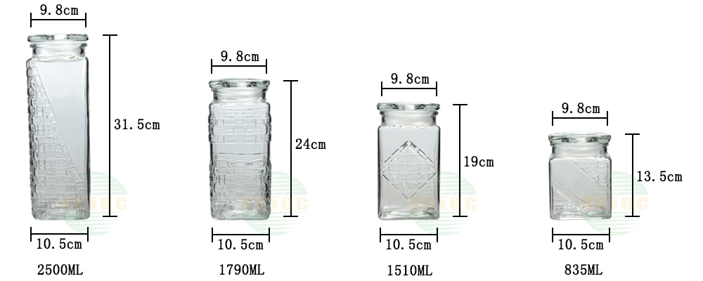 | Features : | • Square glass jar with sealed glass lid and silicone ring • Safe for food,Non-toxic, odorless • Usage : food storage for home kitchen • Sample lead time : 5-10 days • Moq : 1000 pcs • Different styles, sizes and colors are available • Possibility to decorate with spraying color,screen print, decals, frosting etc. • Do logo for customer on the glass for promotion • Packing : inner box bulk packing/color box/white box/display box or at the customer’s request. • Delivery time : 45-60 days after receiving the deposit or L/C |