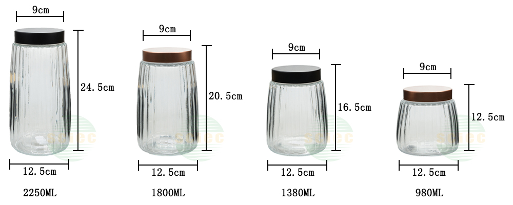 Features : • Round glass jar and wide base with sealed metal or plastic screw lid
